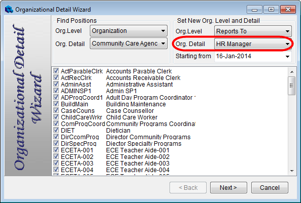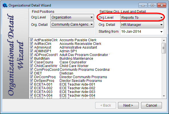 - Under the Set New Org Level and Detail heading at the right side of the dialog, select the Reports To (or equivalent) Org Level from the Org Level list box.