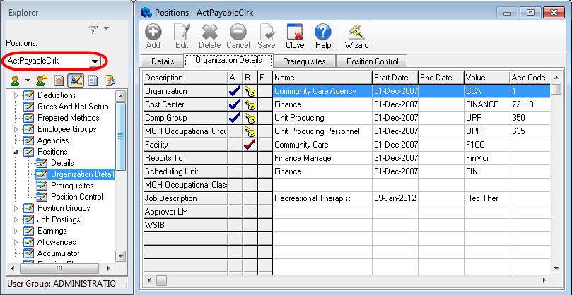This should be an Organization or Facility level so that all of the positions that have been configured for the organization are listed in the lower pane.