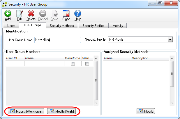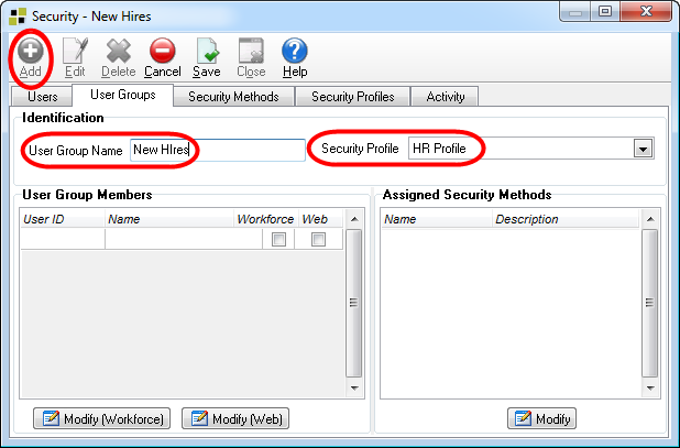 This user group will be specified as the default New Hire user group on the System Configuration window.